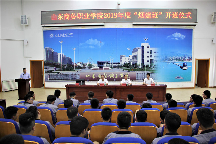 山东商务职业学院建筑工程系隆重举办2019年度“烟建班”开班仪式暨现代学徒制试点项目签约仪式,建筑工程系赵海成主任,烟建集团有限公司总裁助理、人力资源部部长孙福平,及“烟建班”学生与在校学生代表等参加仪式。