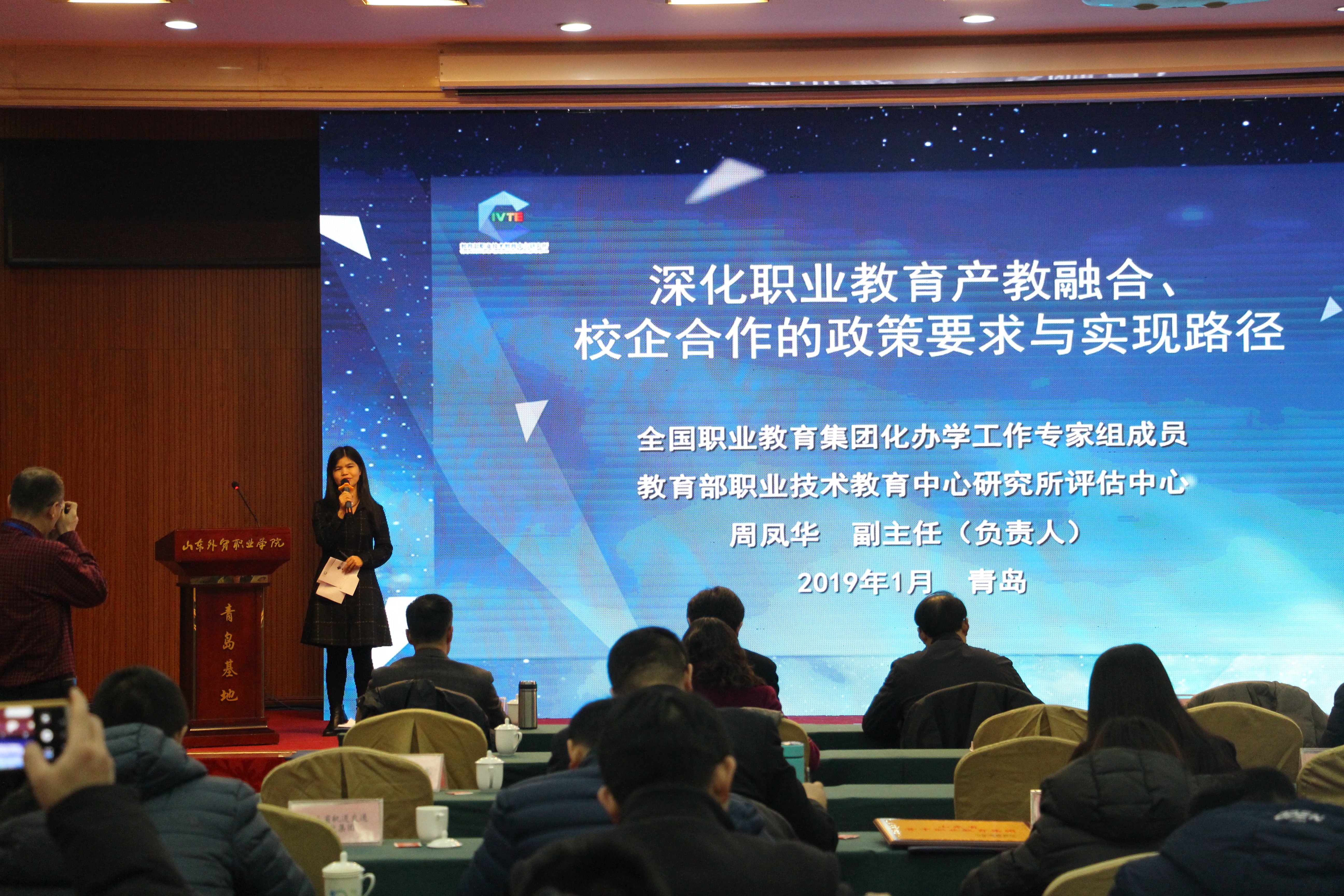 周凤华从历史、机制、创新、贡献四个方面,对山东职业教育集团化办学给予充分肯定。她在《深化职业教育产教融合、校企合作的政策要求与实现路径》报告中,分析了国家有关深化职业教育产教融合、校企合作政策,认为产教融合、校企合作是职业教育跨界性的必然要求,是职业教育实现现代化的必然要求,是职业教育服务经济社会高质量发展的必然要求。提出了管理体制——行业指导——产教对话——集团化办学的实现路径。对山东省畜牧职教集团对口支援四川省甘孜藏族自治州的做法成效给予高度评价。就产教融合未来发展,她认为,应坚持共同任务、共同责任、建立平等伙伴关系的基本理念,健全共同规划、共同决策、共同制订标准、共同实施、共同评价和共享资源、共同培养、共同考核的体制机制,加强行业能力建设,赋予行业组织参与规划决策及实施的职责、渠道,完善优惠政策,包括行业举办职业教育经费补偿、企业参与职业教育税收优惠和补偿、师生企业实践工伤保险等。