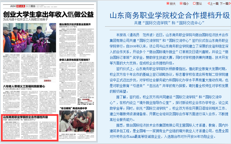 近日,山东商务职业学院与烟台国际经济技术合作集团有限公司共建“国际交流学院”和“国际交流中心”签约仪式在山东商务职业学院举行。自2008年以来,该公司与山东商务职业学院建立了深厚的友谊和稳定深入的合作关系,开设多个“烟台国际境外就业”订单班及日语兴趣班,并设立“烟台国际订单班”奖学金,赞助学生技能大赛,同时对学校提供横向课题、技术开发等方面的大力支持,促成校企合作提档升级。