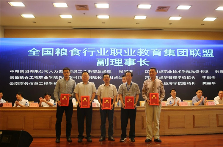 会上审议通过了《全国粮食行业职业教育集团联盟章程》以及联盟第一届组织机构,选举了理事长1名,副理事长6名,理事32名,聘请河南工业大学、武汉轻工大学、南京财经大学、湖北大学为联盟顾问单位。山东省粮食职业教育集团理事长、山东商务职业学院党委书记耿建敏当选为全国粮食行业职业教育集团联盟第一届理事长。示范性全国粮食行业职业教育集团的中粮集团有限公司人力资源部员工关系部总经理张明睿,江苏财经职业教育集团的江苏财经职业技术学院党委书记韩香云,安徽经济技术职业教育集团的安徽粮食工程职业学院党委副书记、副院长甘光生,河南省科贸职业教育集团的河南省经济管理学校校长李俊伟,云南粮油职业教育集团的云南商务信息工程学校副校长李景云以及新疆粮油食品职业教育联盟的新疆工业经济学校副站长樊丽华等当选为联盟第一届副理事长。全国粮食职业教育教学指导委员会秘书长唐柏飞为联盟理事长、副理事长、顾问单位颁发聘书。