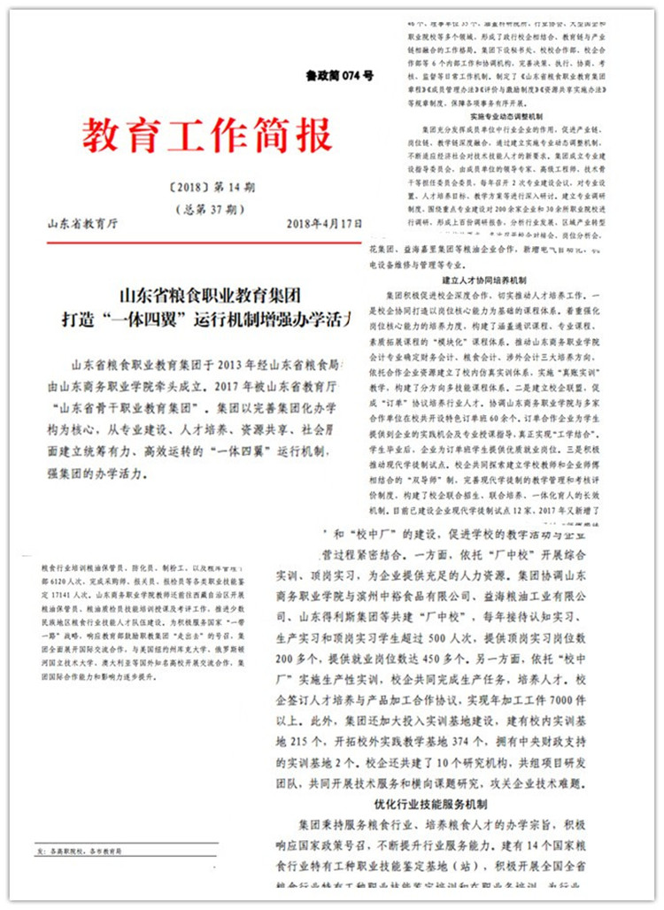 2018年4月17日,山东省教育厅《教育工作简报》在2018年第14期刊发我校集团化办学成果,具体刊文内容如下: