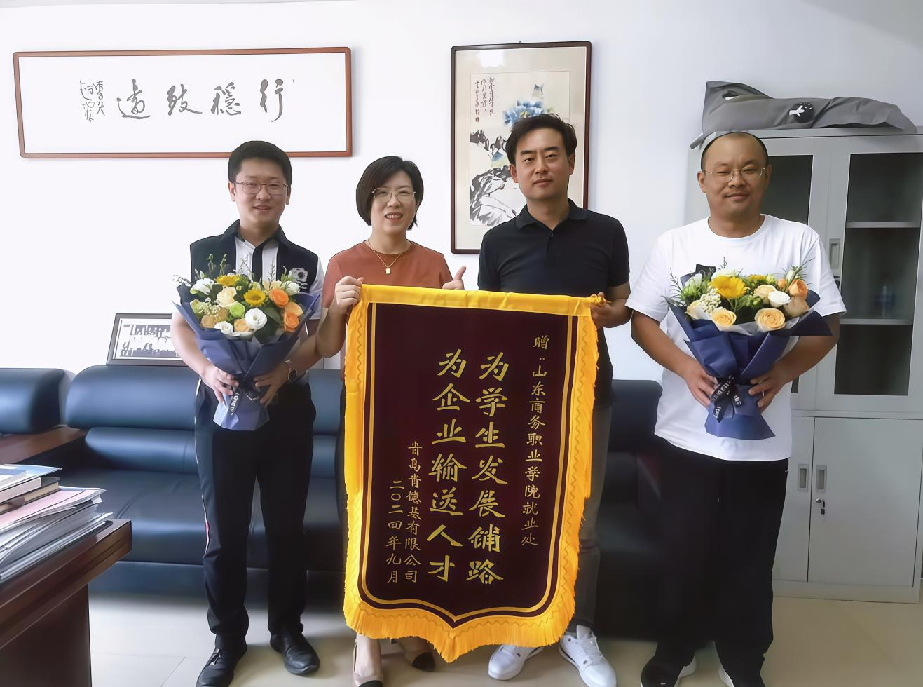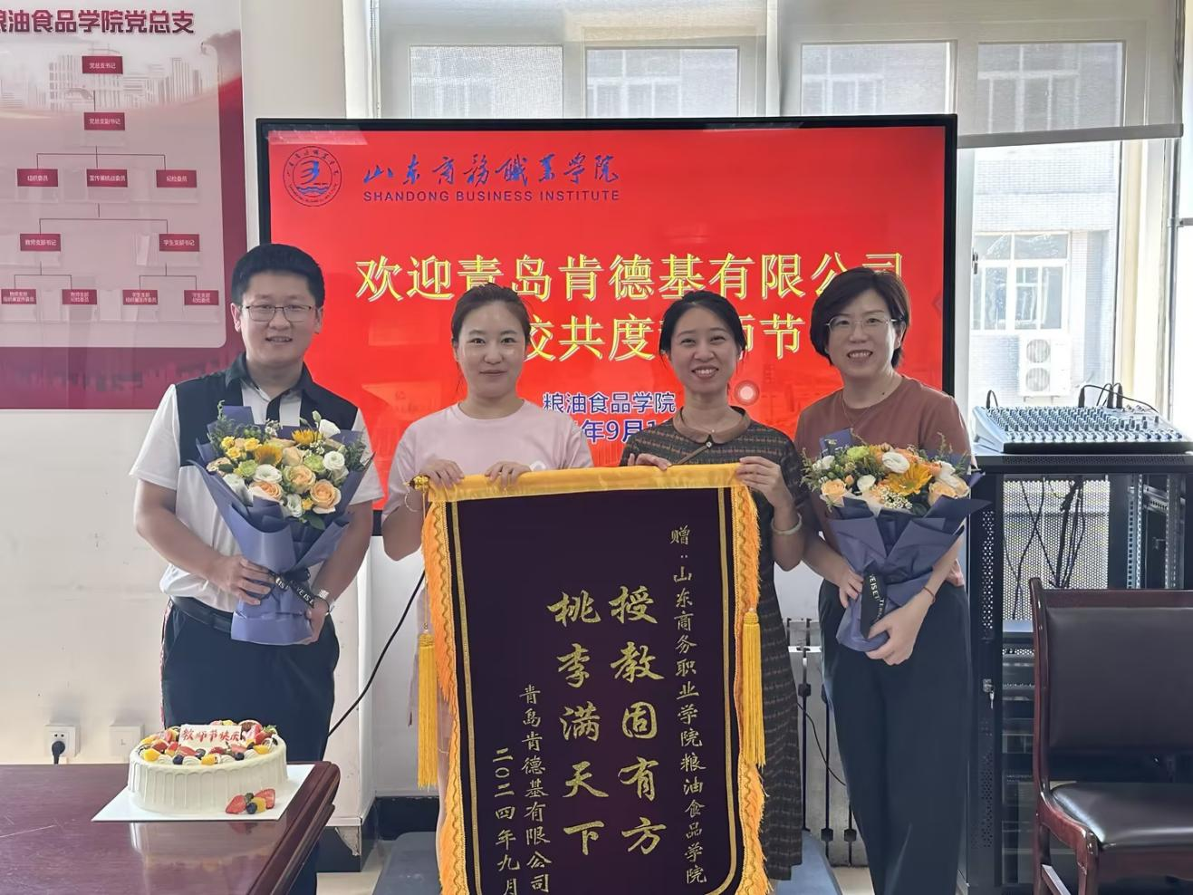 9月9日上午,在第40个教师节来临之际,百胜中国控股有限公司山东分公司烟台地区负责人齐翠玲、门店负责人刘杰来到我校洽谈交流,并分别为校企合作与就业工作处和粮油食品学院的老师送上锦旗与节日的祝福。