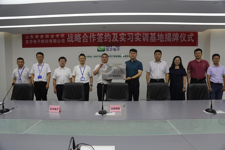 仪式上,张云生与陈勇代表双方签署《山东商务职业学院&东方电子股份有限公司校企战略合作与订单班协议书》。信息工程学院院长孙玉林与东方电子股份有限公司工程中心总经理王琳共同为“山东商务职业学院信息工程学院实习实训基地”揭牌。