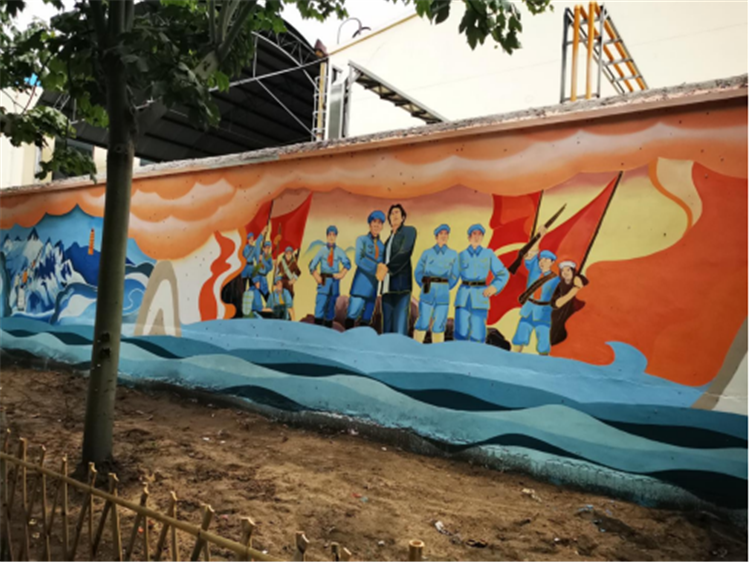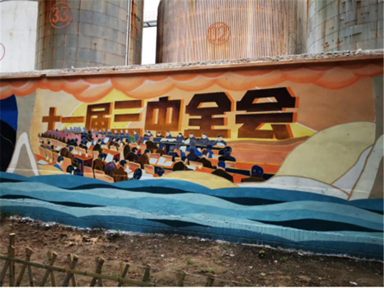 中粮龙口百年华诞彩绘墙项目由艺术设计学院广告专业的老师带领学生历时33天绘制完成,面积2300余平方,主题为“辉煌100载”,采用国风插画的形式,以其细腻的画风、高级的色调、娴熟的技法,将苍松、绿山、红旗、华表、天安门、长城、天坛等元素融合一体,设计典雅,既有着喜迎中国共产党建党100周年的气魄,又有着国潮元素的精致,还有着绘画色调技法的细腻,整体感觉磅礴大气又有时代进步感。临街西墙面长达300米,采用新华社官方近年最火的一组全国教育性党史插画进行绘制,这组插画描绘了旧中国到中国共产党成立,中华人民共和国成立再到现在的民族复兴,是一部波澜壮阔的中国共产党奋斗史,不仅具有教育意义,还兼具美学震撼力。