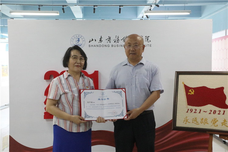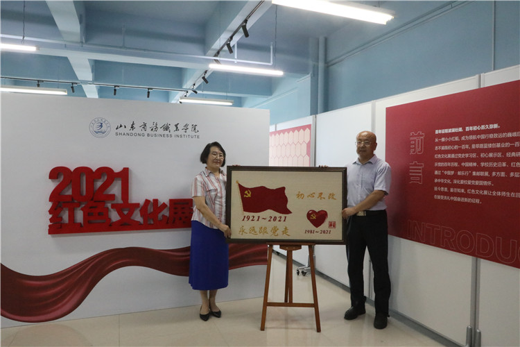 高守莲女士是一名拥有40年党龄的老党员,在2019年我校第十届大学生读书文化节期间与我校结下不解之缘,并被美丽的“大商务”校园深深吸引。在举国上下庆祝中国共产党成立100周年之际,她怀着对党的深厚感情,用烟台省级非物质文化遗产工艺绣出了“党旗在我心中,永远跟党走”的绒绣作品,并捐赠与我校,希望与我校师生共庆党的百岁华诞!