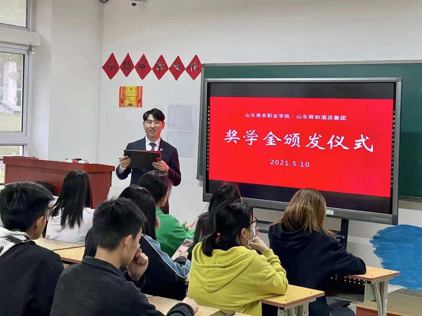 为深化文化旅游学院与山东舜和酒店集团校企合作,提高学生们的实践能力,近日文化旅游学院酒店管理与数字化运营专业在旅游与酒店形体室开展了“舜和职业经理班”餐饮服务与管理的汇报演示,舜和酒店集团向表现优异的2019级、2020级“舜和职业经理班”的学生颁发了奖学金。
