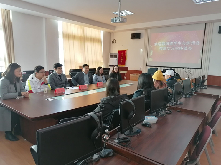 12月3日,商务外语系举办赴韩国留学与济州岛实习学生座谈会,烟台国际经济技术合作集团部长张坤、陈豪,商务外语系李刚,应用韩语教研室教师和出国学生出席了本次会议。